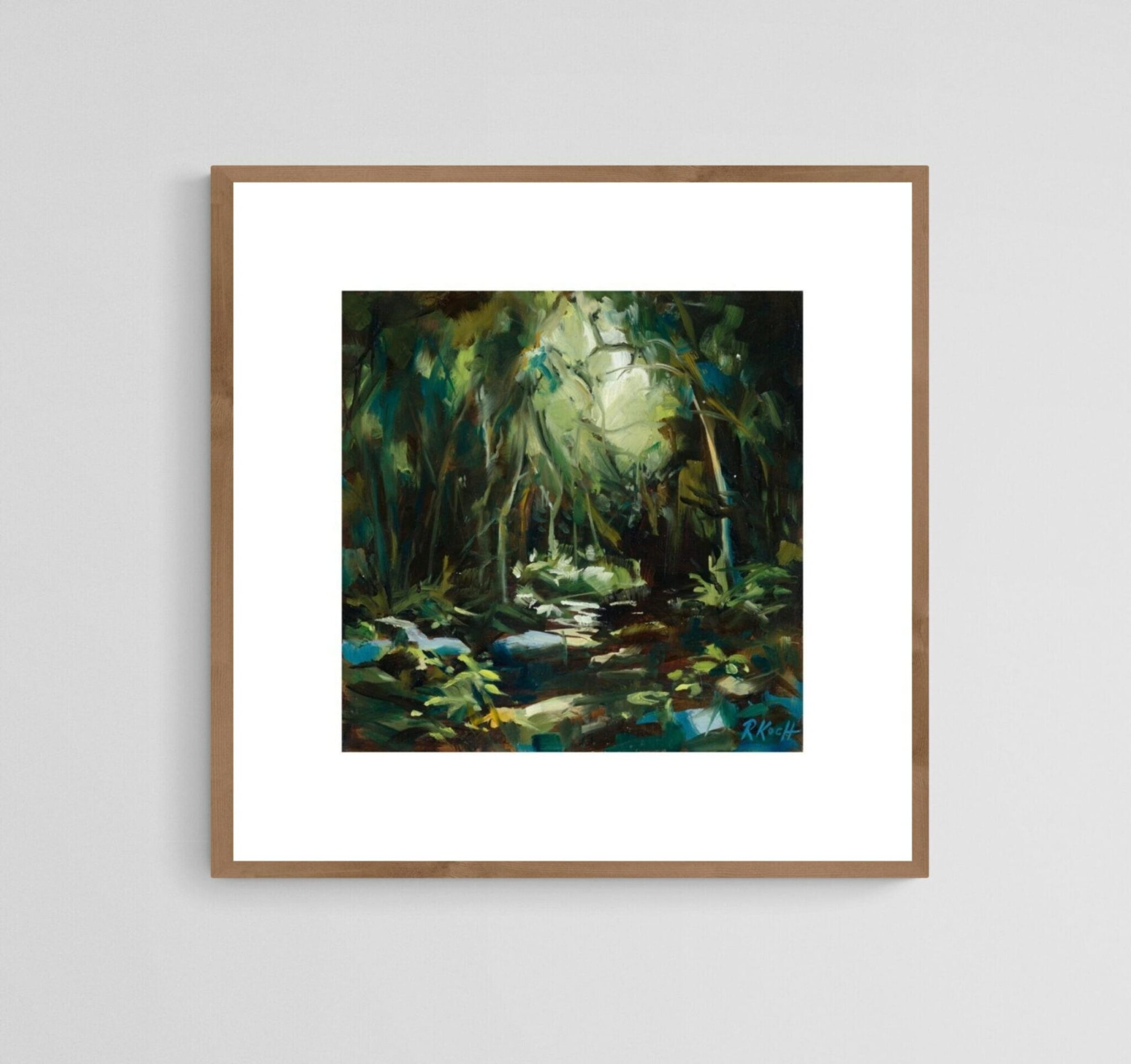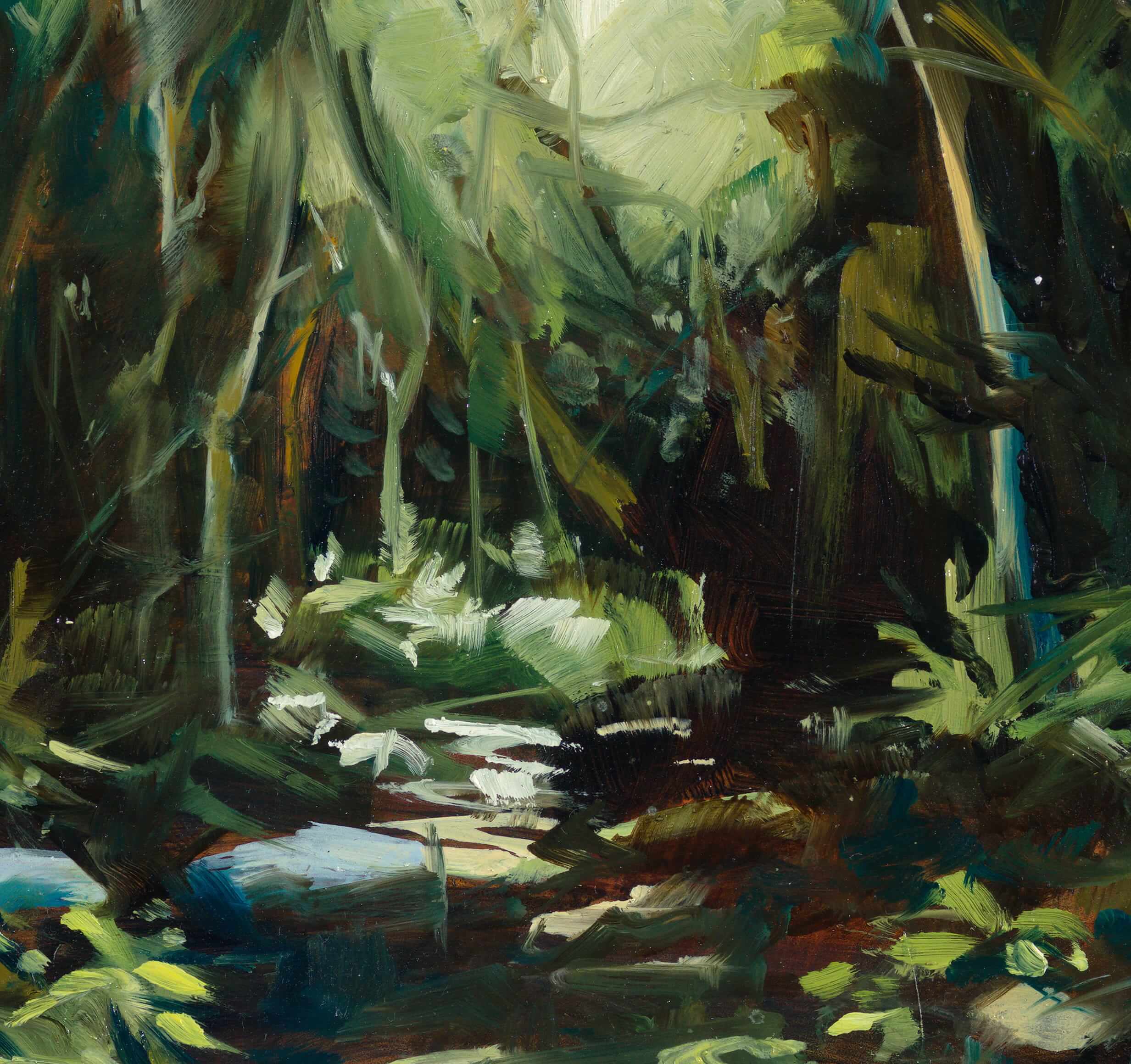 This painting was inspired by a line taken from W.B. Yeats’ poem, “The Land of Heart’s Desire” (1894). The line is sung by the faeries (the “good people”) to entice a young bride away from her human life into the “Land of Faery,” where they promise she will never grow old, grave, or wise. Just like Yeats’s poem, this work is entirely fictional. I wanted to create a woodland scene which suggests a cool, hidden, and mystical place.