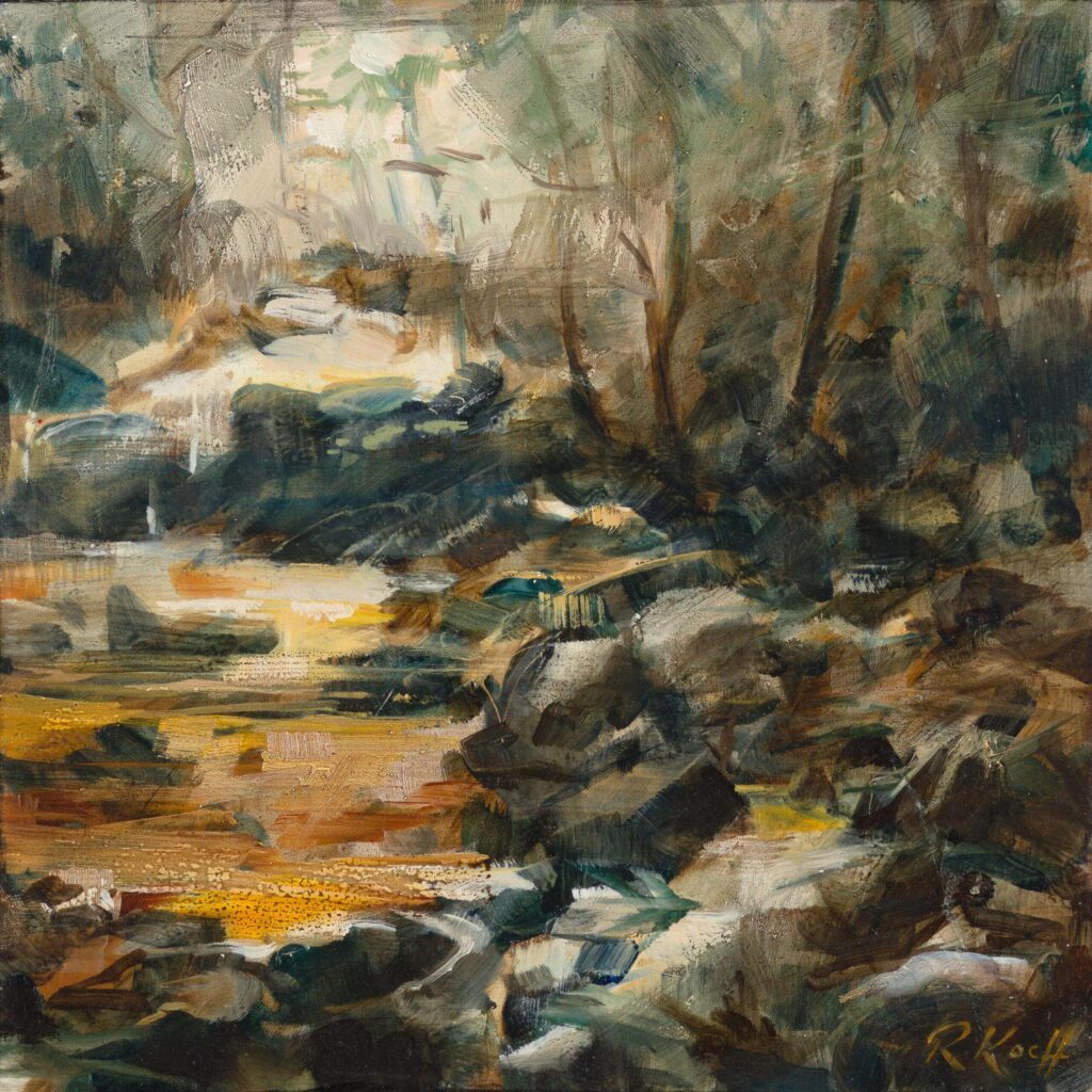 Keepers of my heart is a profound and romantic expression which often refers to a person – or in some contexts, God. It’s a phrase we often use for someone who is trusted with our deepest emotions, love, and vulnerability. I was walking alone in the mountains one day and I found a freshwater pool, ‘guarded’ by these ancient trees. I had a strong feeling that these trees were – in some way – protecting me and holding me. I created this painting of an imaginary scene to honour that moment.