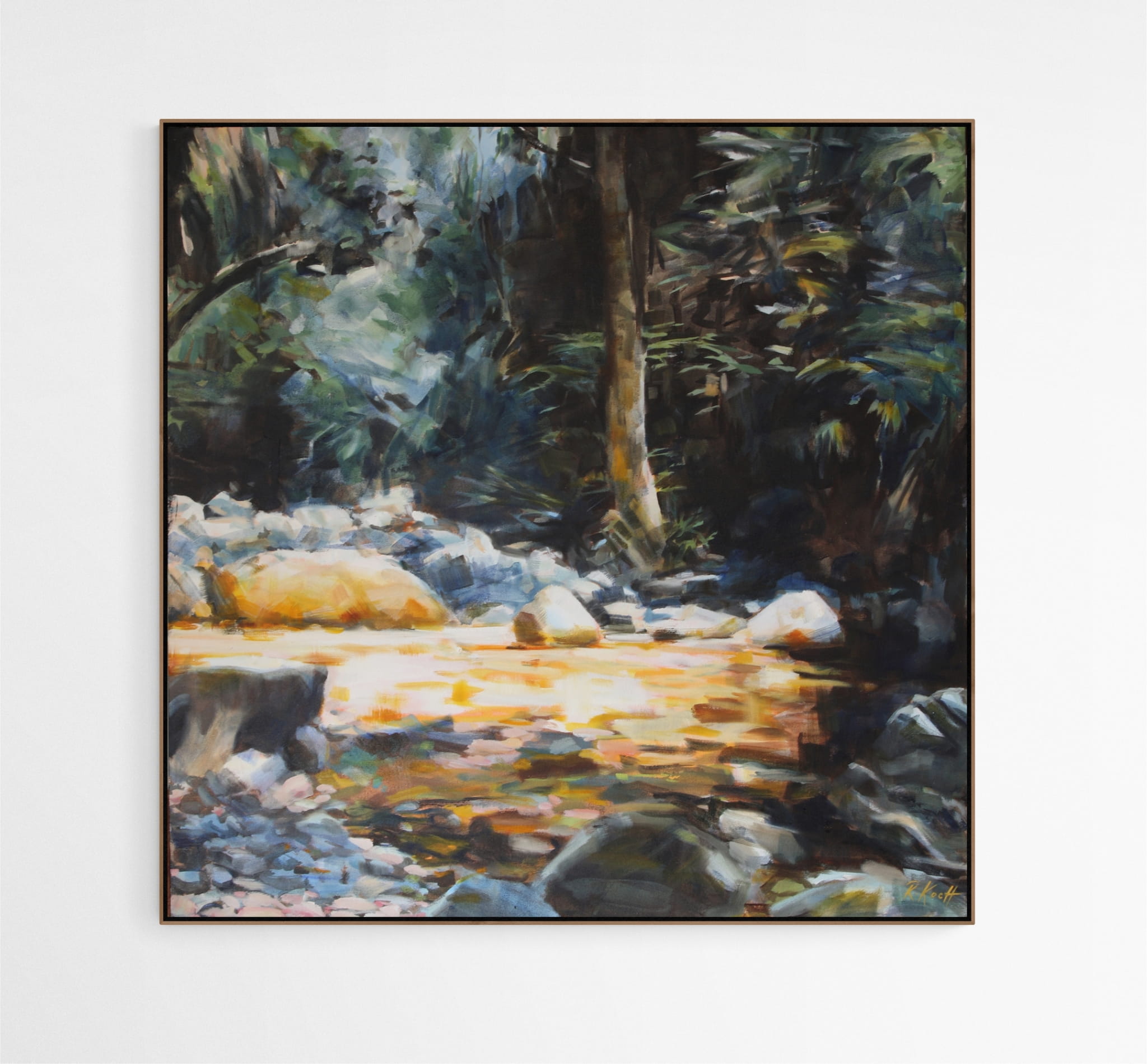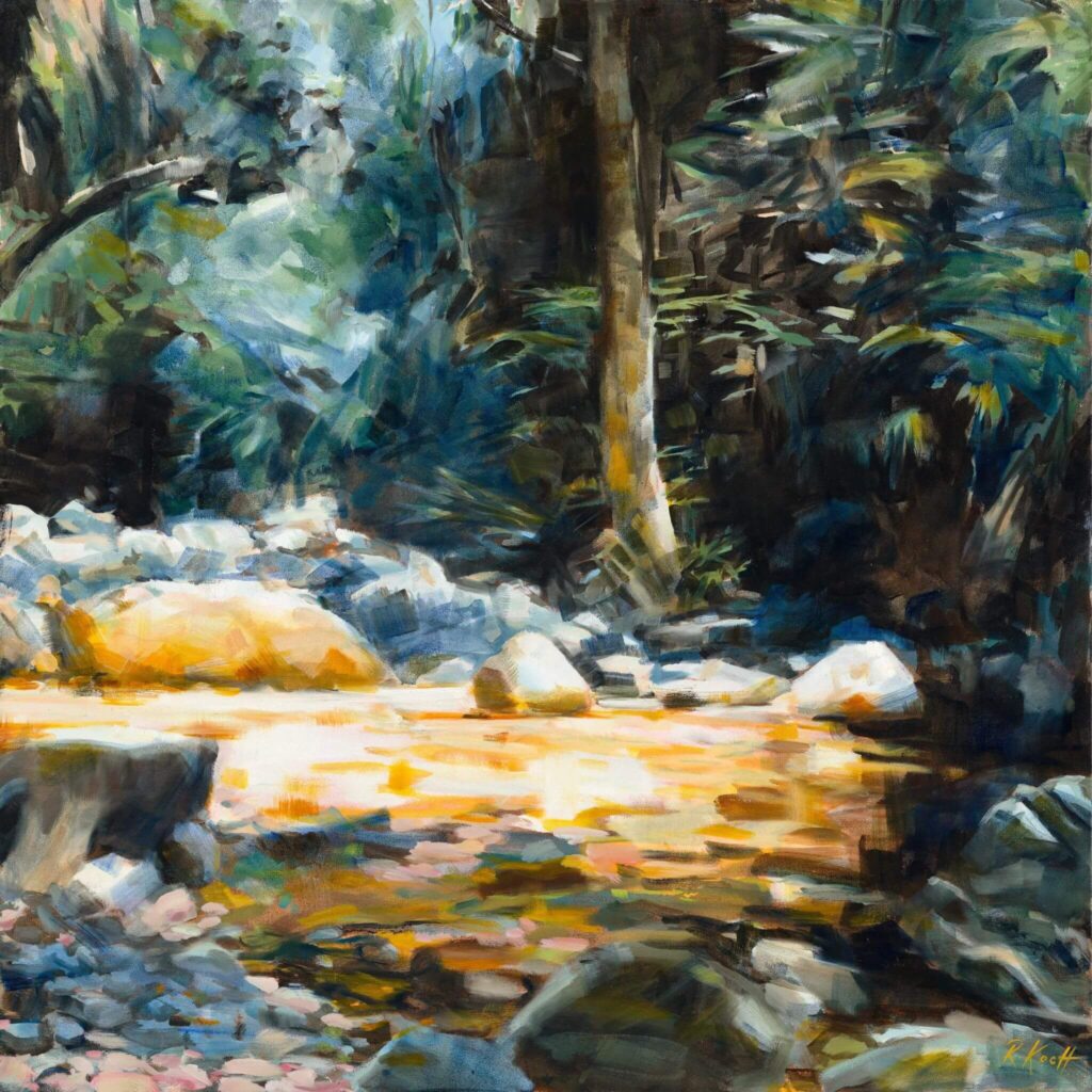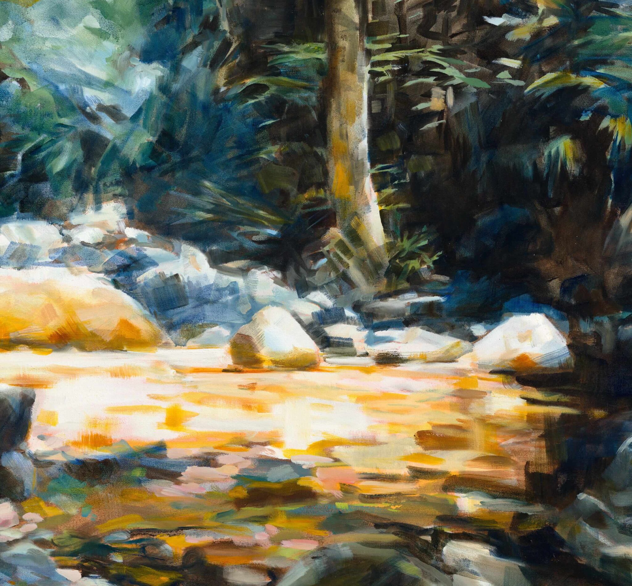 It is a painting made with loose brushstrokes, from memory and imagination combined, using sketches as reference. I wanted to emulate the urgency of the water too so I chose to work in acrylic, knowing I’d have to work faster (as the layers dry much faster than oils) and in a more gestural way. Fast, bold strokes, big brushes, allowing for paint to splatter and splash. It was great fun to do and I hope the viewer enjoys the playful nature of the composition, bolder palette and techniques I’ve used.
